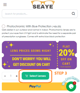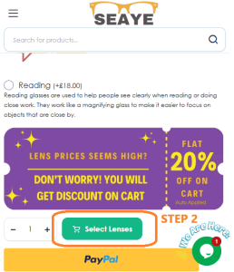 Step 2: Now you are on “Prescription Page”. You might see price of lenses are high here. But do not worry. you will get 20% flat discount on cart, which is auto applied. It will reduce the prices to same level what you seen during advt on social media. Now choose your prescription type either you need varifocal (progressive) or distance or any other prescription and click ”Select Lenses’. see picture below: